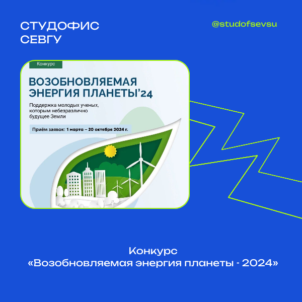С 1 марта до 30 сентября 2024 г. открыт прием заявок для участия во Всероссийском конкурсе студентов, аспирантов и молодых учёных «Возобновляемая энергия планеты 2024», организованный Ассоциацией развития возобновляемой энергетики с целью развития молодежной науки, поиска новых талантливых ученых, поиска решений, разработок в области возобновляемой энергетики и защиты окружающей среды, которые открывают человечеству новые горизонты в решении задач энергетики.К участию в конкурсе приглашены студенты, аспиранты, молодые ученые вузов России, СНГ и дальнего зарубежья, а также специалисты отрасли в возрасте до 30-ти лет. Конкурсантам предлагается представить свои работы как в ставших традиционными номинациях по развитию ветряной, солнечной или иных видов зеленой генерации в России, так и по темам развития электротранспорта и водородной энергетики, а также «зелёного» финансирования. На конкурс могут быть представлены полностью завершенные научные работы, выполненные либо самостоятельно, либо коллективом в составе до 3-х человек. Подробнее ознакомиться с требованиями и подать заявку на участие можно на официальном сайте конкурса